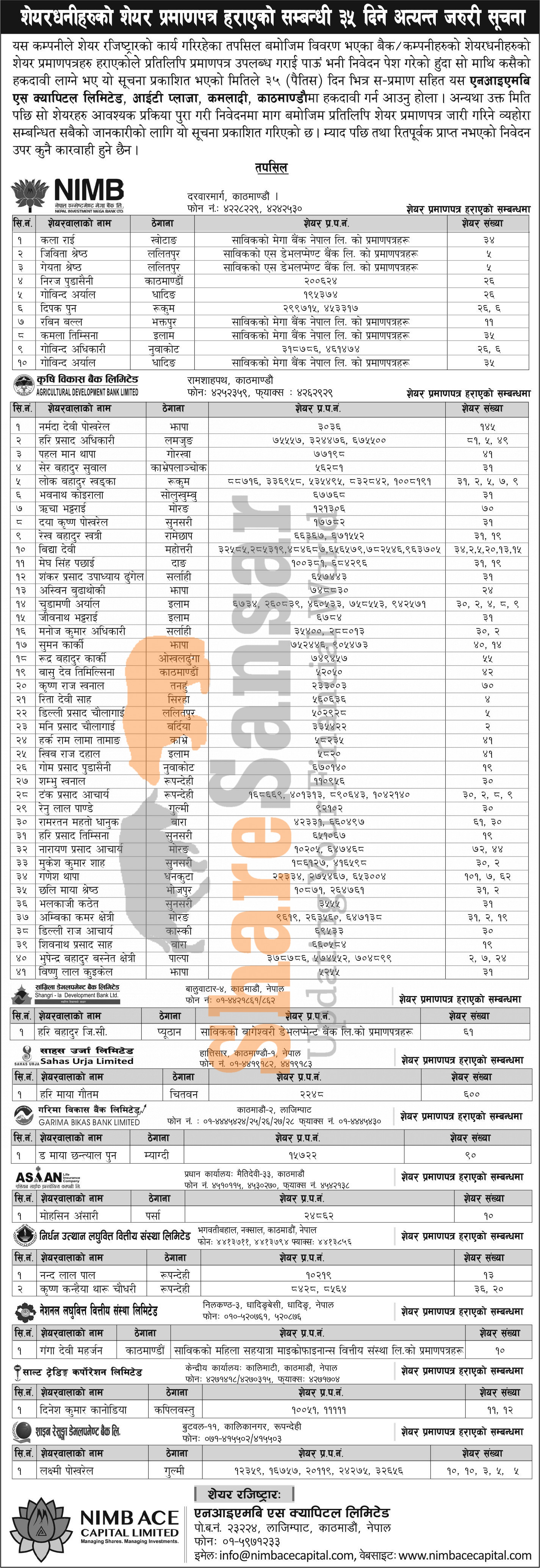 NIMB Ace Capital Limited has published a notice regarding a claim for lost share certificates.
