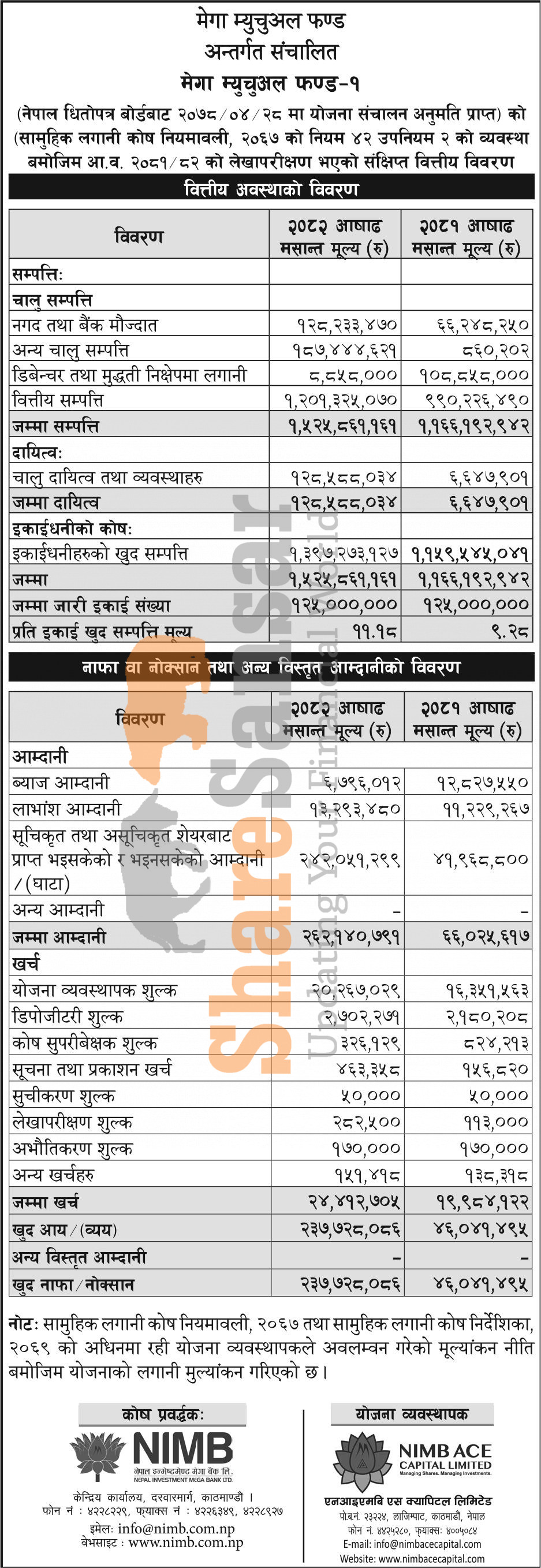 NIMB Ace Capital Limited has published the audited financial highlights of "Mega Mutual Fund - 1" of the fiscal year 2081/82.