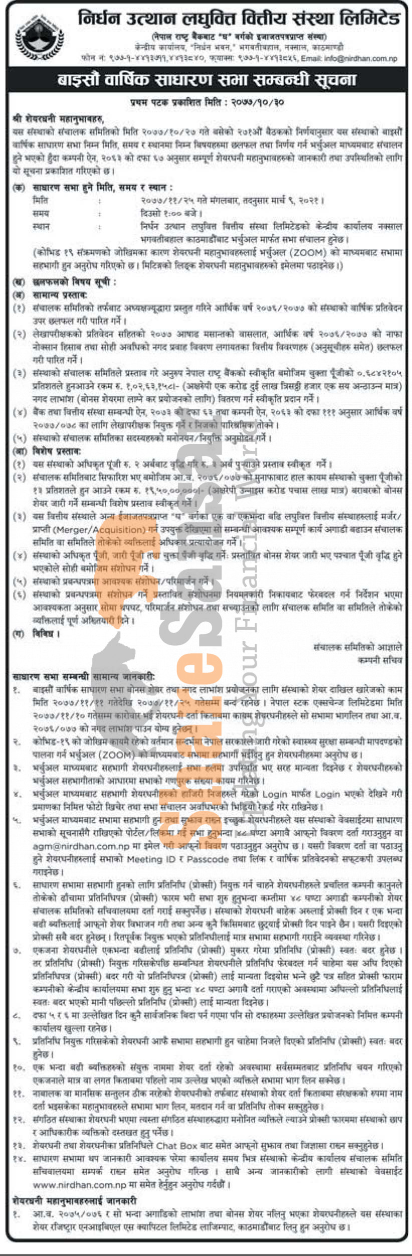 Nirdhan Utthan Laghubitta Bittiya Sanstha Limited has announced its 22nd AGM going to be held on 25th Falgun, 2077.