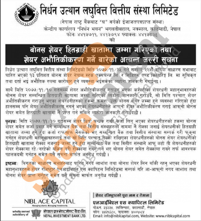 Nirdhan Utthan Laghubitta Bittiya Sanstha Limited has distributed 13% bonus shares directly to DEMAT accounts of its shareholders and has urged to dematerialize their shares.