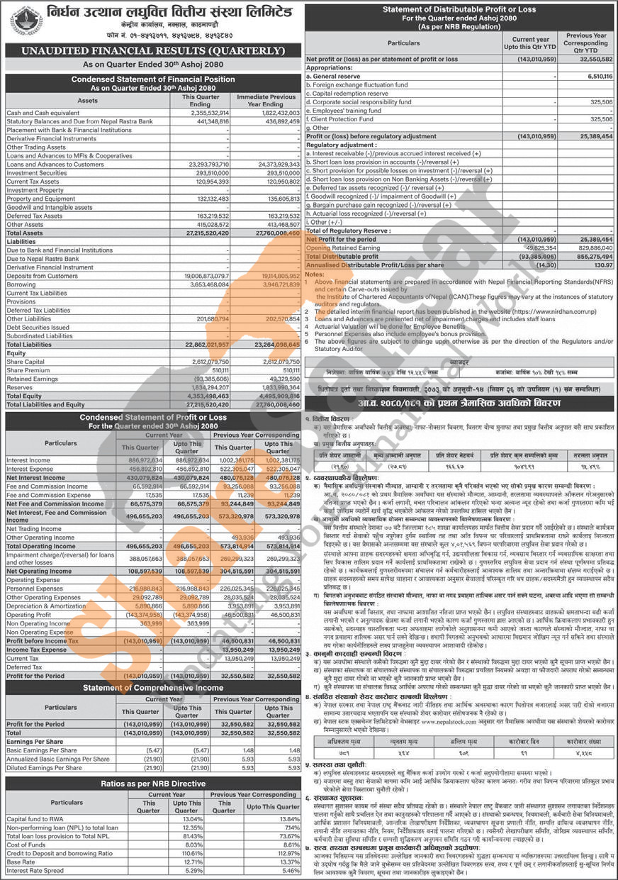 Nirdhan Utthan Laghubitta Bittiya Sanstha Limited has posted a net loss of Rs 143.01 million and published its 1st quarter company analysis of the fiscal year 2080/81.