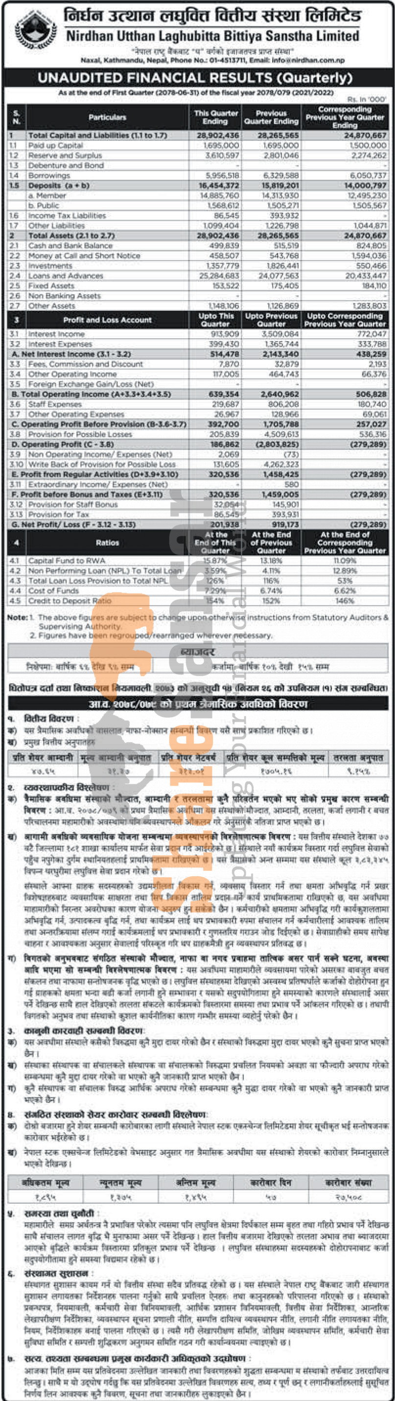 Nirdhan Utthan Laghubitta Bittiya Sanstha Limited has posted a net profit of Rs 201.93 million and published its 1st quarter company analysis of the fiscal year 2078/79.