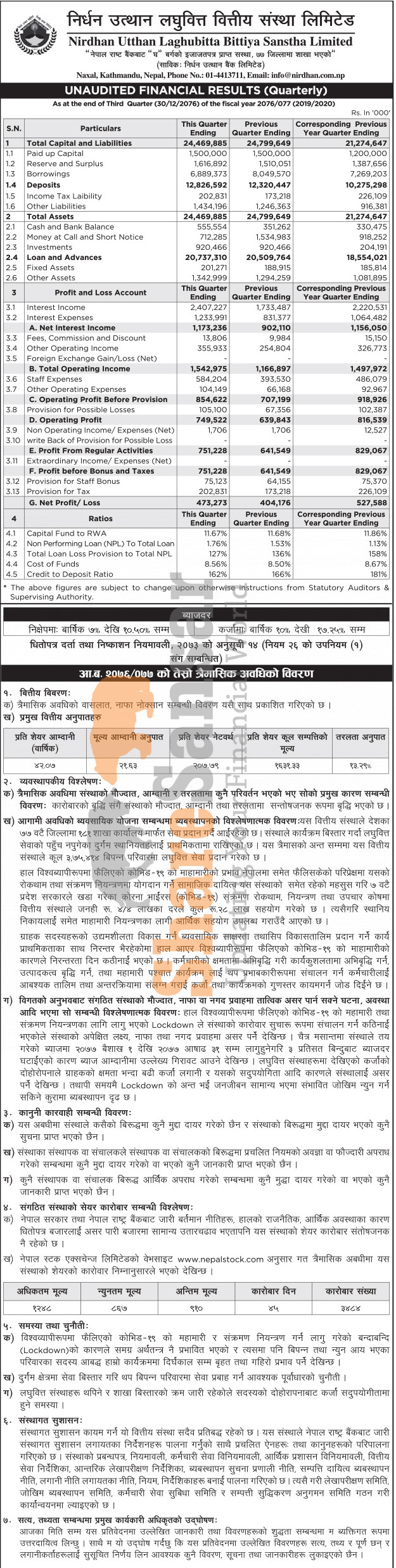 Nirdhan Utthan Laghubitta Bittiya Sanstha Limited has posted a net profit of Rs 473.27 million and published its 3rd quarter company analysis of the fiscal year 2076/77.