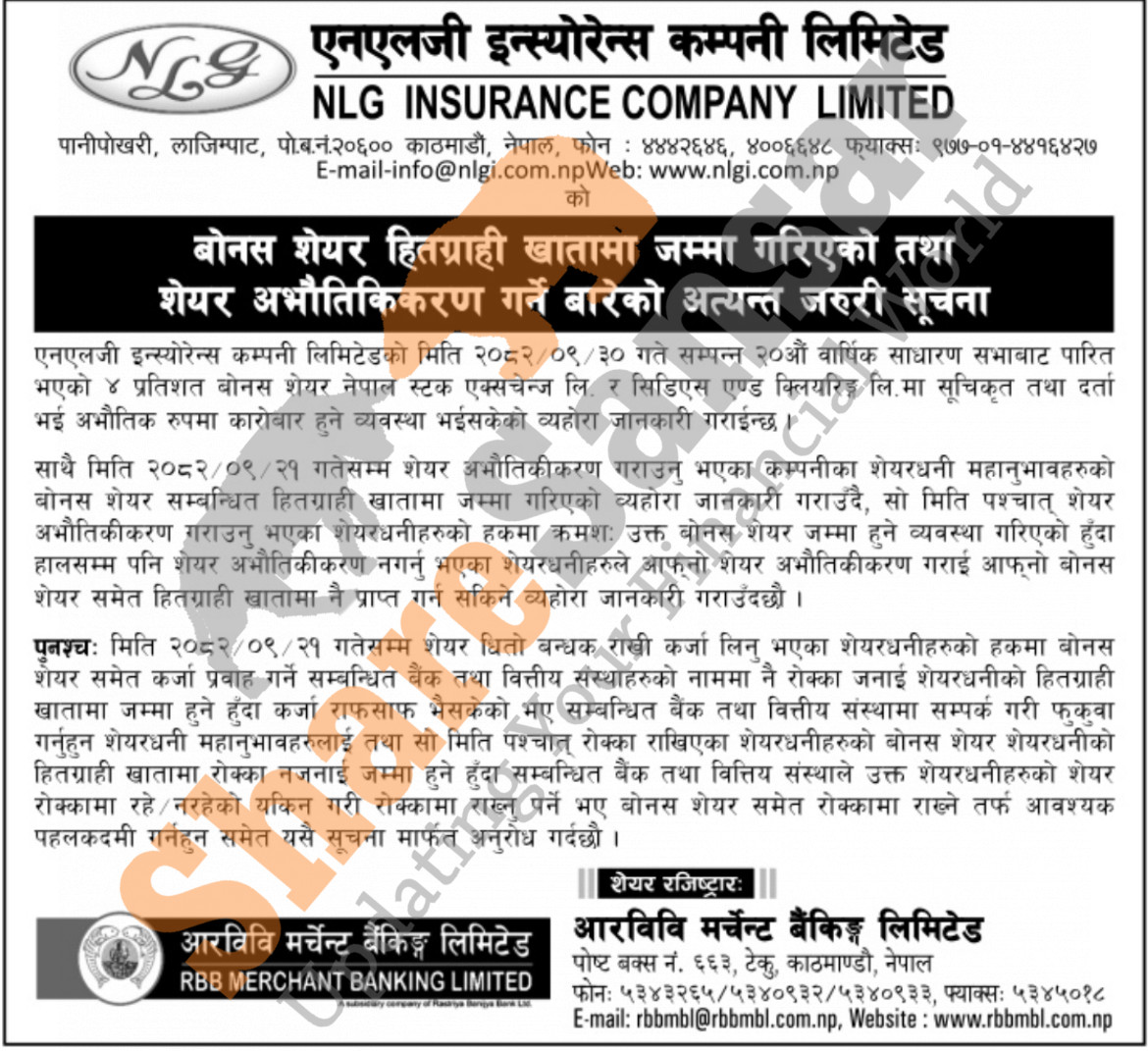 NLG Insurance Company Limited has distributed 4% bonus share directly to DEMAT accounts and urged its shareholders to dematerialize their shares.
