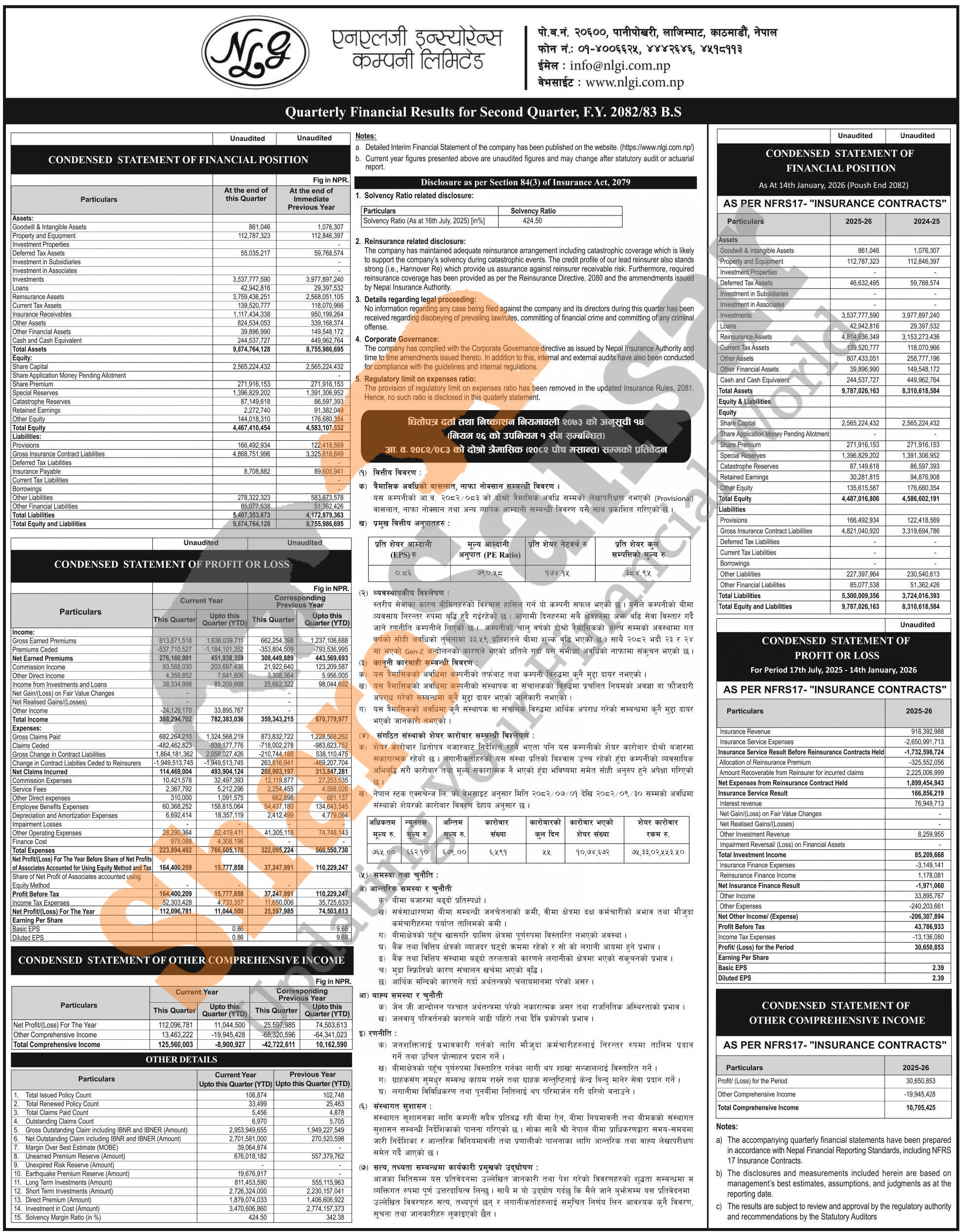 NLG Insurance Company Limited has posted a net profit of Rs 11.04 million and published its 2nd quarter company analysis of the fiscal year 2082/83.
