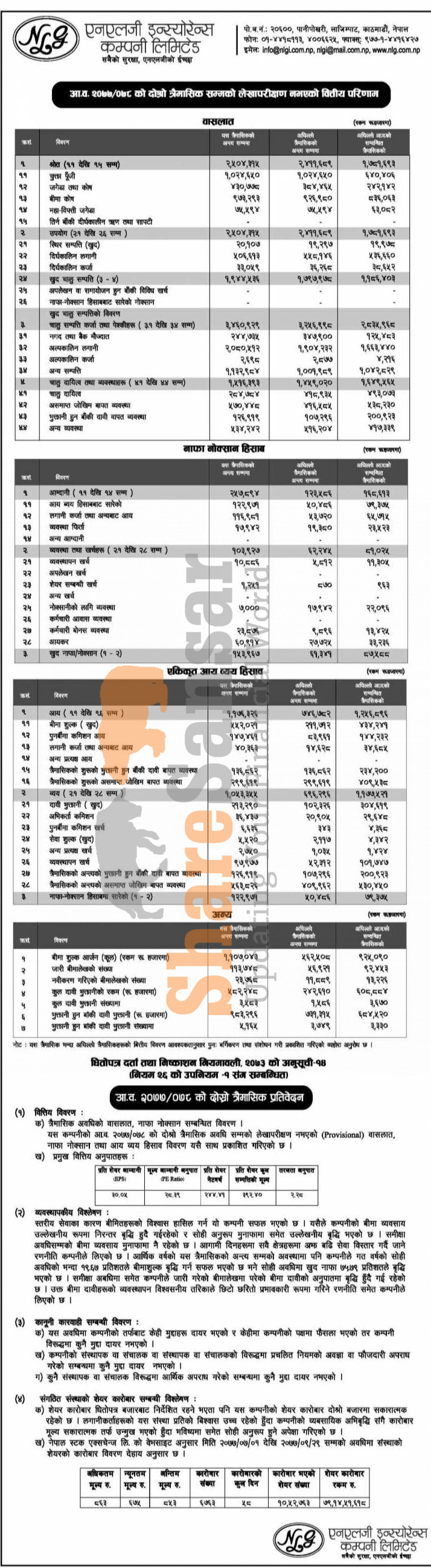 NLG Insurance Company Limited has posted a net profit of Rs 153.96 million and published its 2nd quarter company analysis of the fiscal year 2077/78.