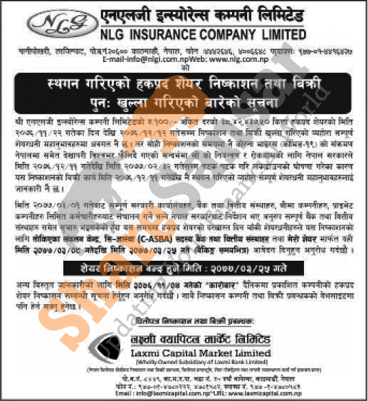 NLG Insurance Company Limited is reissuing it's postponed 10:6 ratio 38,42437.5 units right share to its shareholders from (9th to 25th Ashad, 2077).