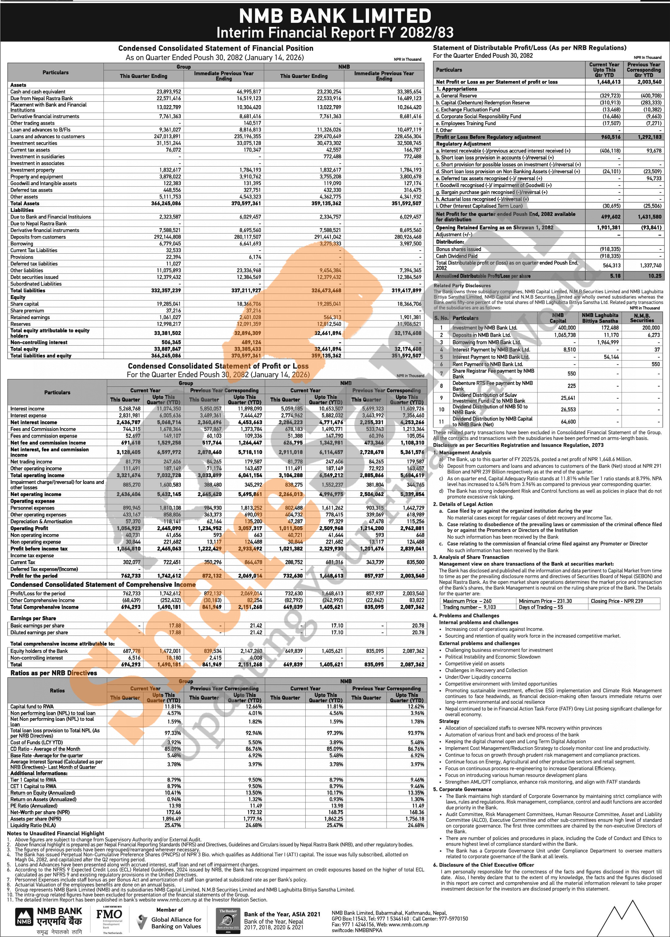NMB Bank Limited has posted a net profit of Rs 1.64 billion and published its 2nd quarter company analysis of the fiscal year 2082/83.