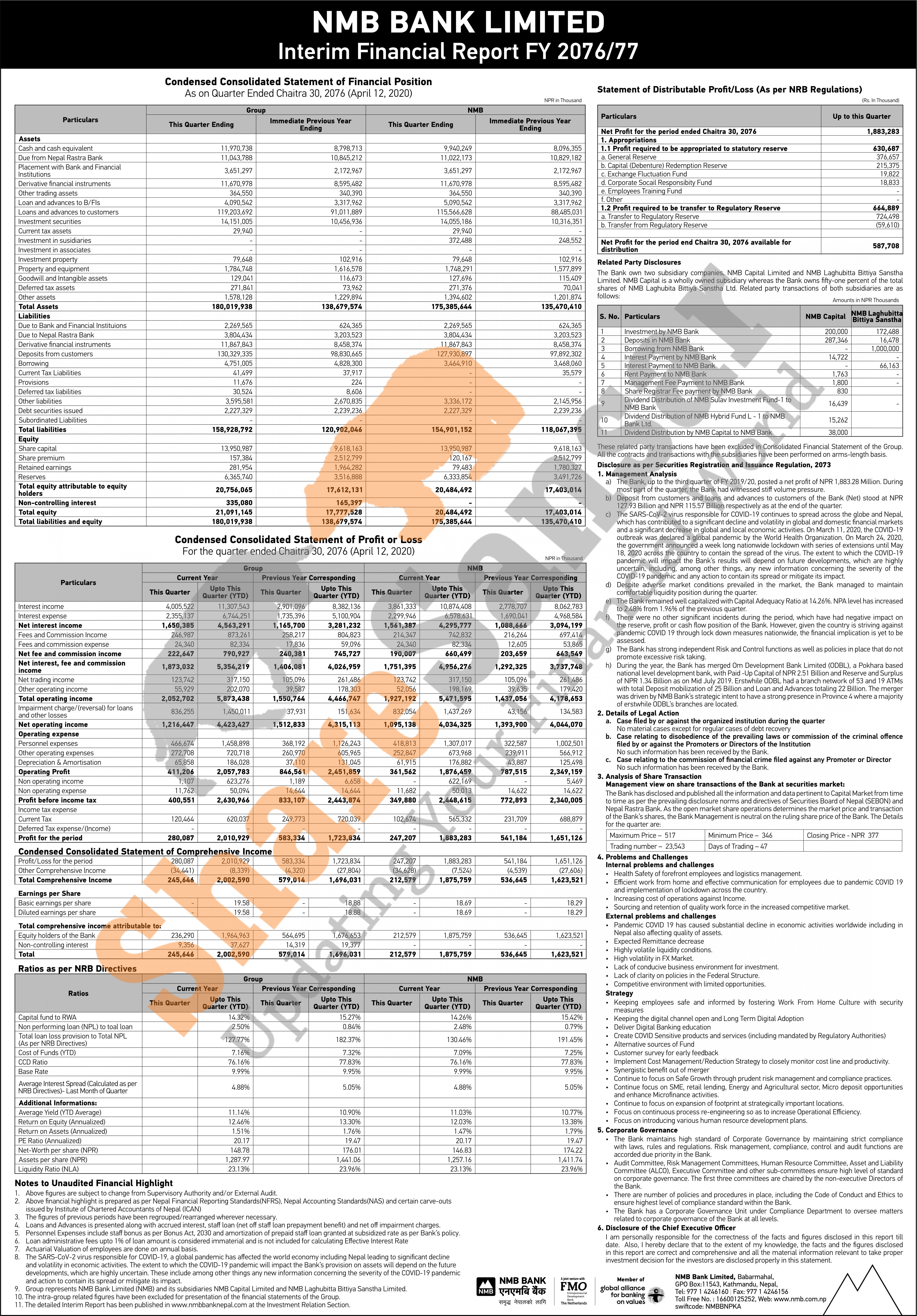 NMB Bank Limited has posted a net profit of Rs 1.88 billion and published its 3rd quarter company analysis of the fiscal year 2076/77.