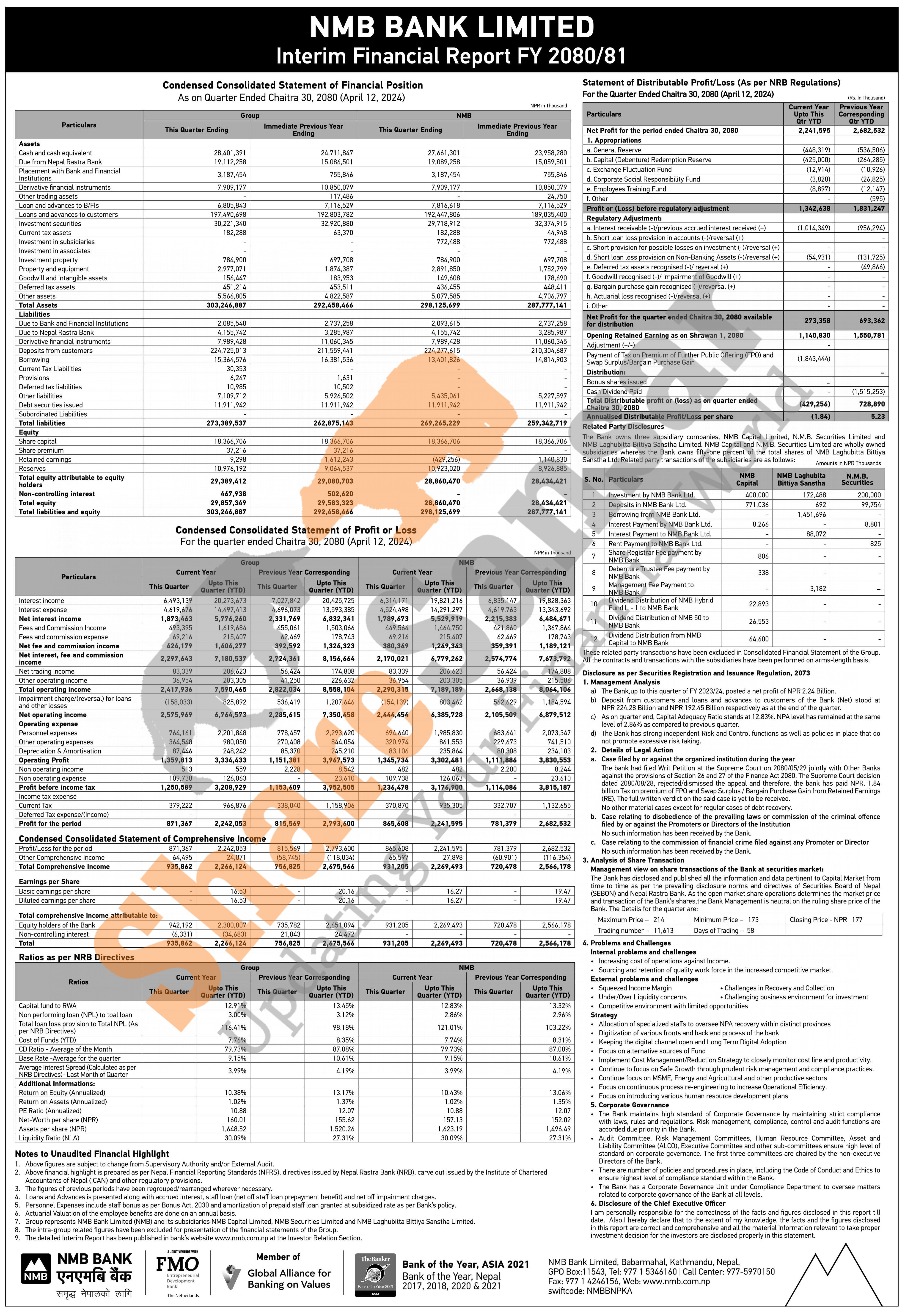 NMB Bank Limited has posted a net profit of Rs 2.24 billion and published its 3rd quarter company analysis of the fiscal year 2080/81.
