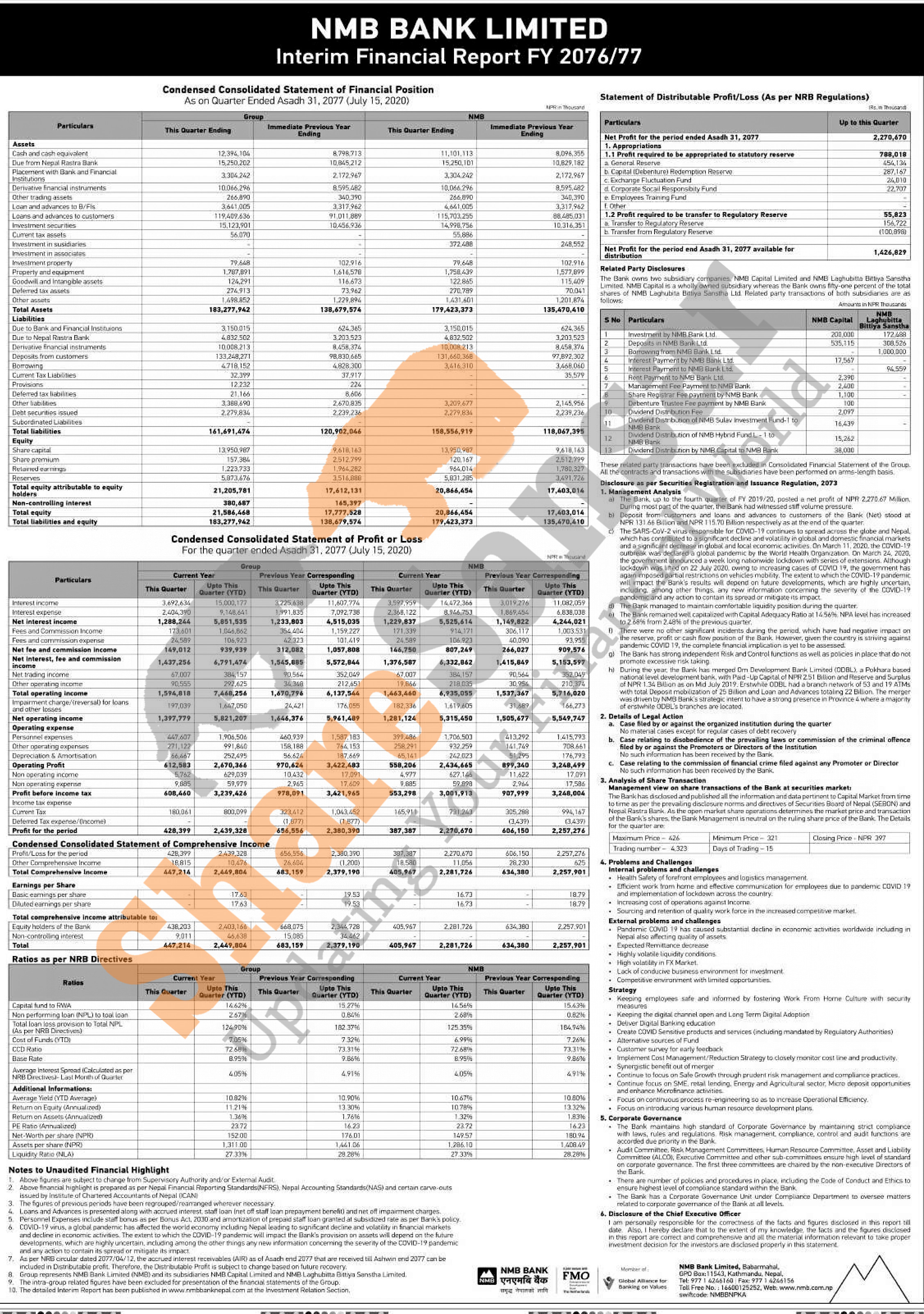 NMB Bank Limited has posted a net profit of Rs 2.27 billion and published its 4th quarter company analysis of the fiscal year 2076/77.