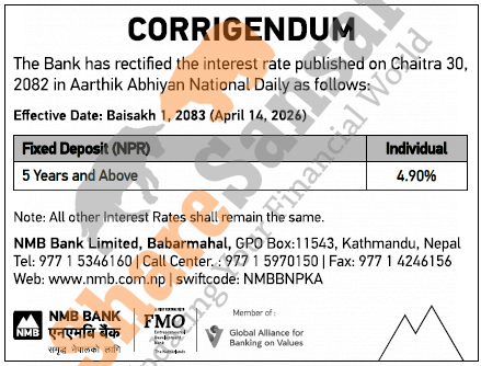 NMB Bank Limited has published a notice regarding correction on its interest rate for deposit which was published on 30th Chaitra, 2082.
