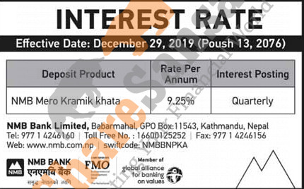 NMB Bank Limited has published a notice regarding new interest rate and its effective from 13th Poush, 2076.