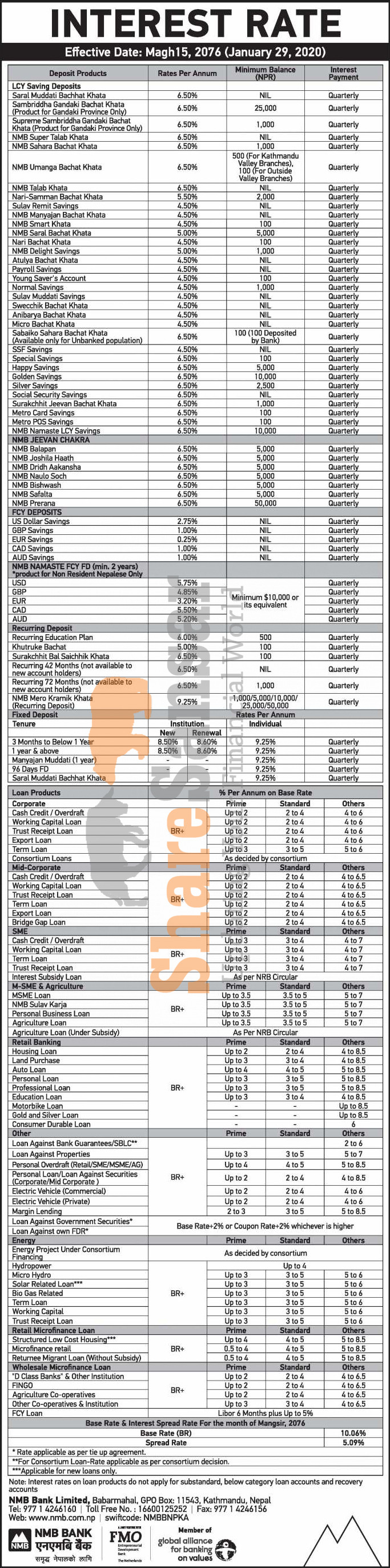 NMB Bank Limited has published a notice regarding new interest rate and its effective from 15th Magh, 2076.