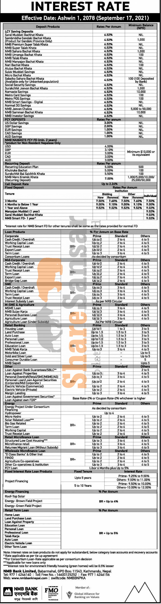 NMB Bank Limited has published a notice regarding the new interest rate for deposit and loan products and it's effective from 1st Ashwin, 2078.
