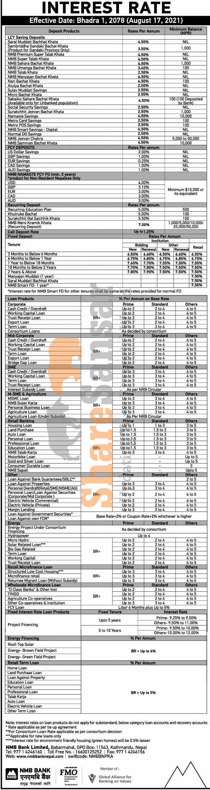 NMB Bank Limited has published a notice regarding the new interest rate for deposit and loan products and it's effective from 1st Bhadra, 2078.