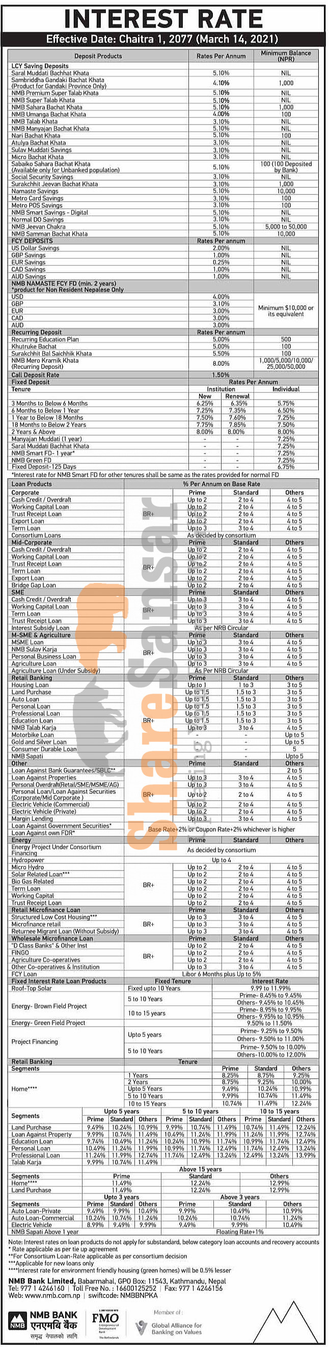 NMB Bank Limited has published a notice regarding the new interest rate for deposit and loan products and it's effective from 1st Chaitra, 2077.
