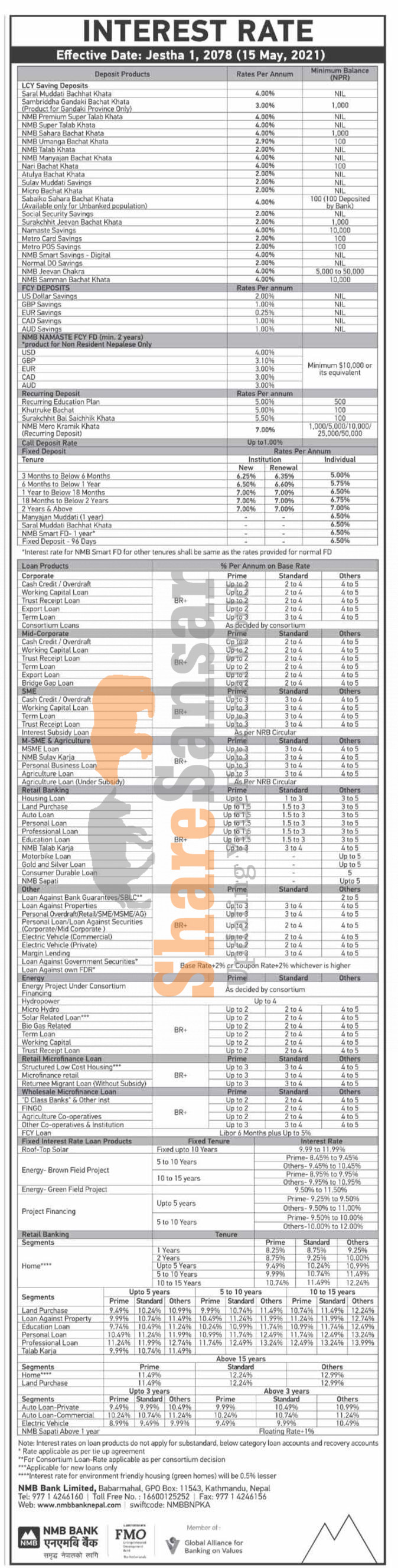 NMB Bank Limited has published a notice regarding the new interest rate for deposit and loan products and it's effective from 1st Jestha, 2078.