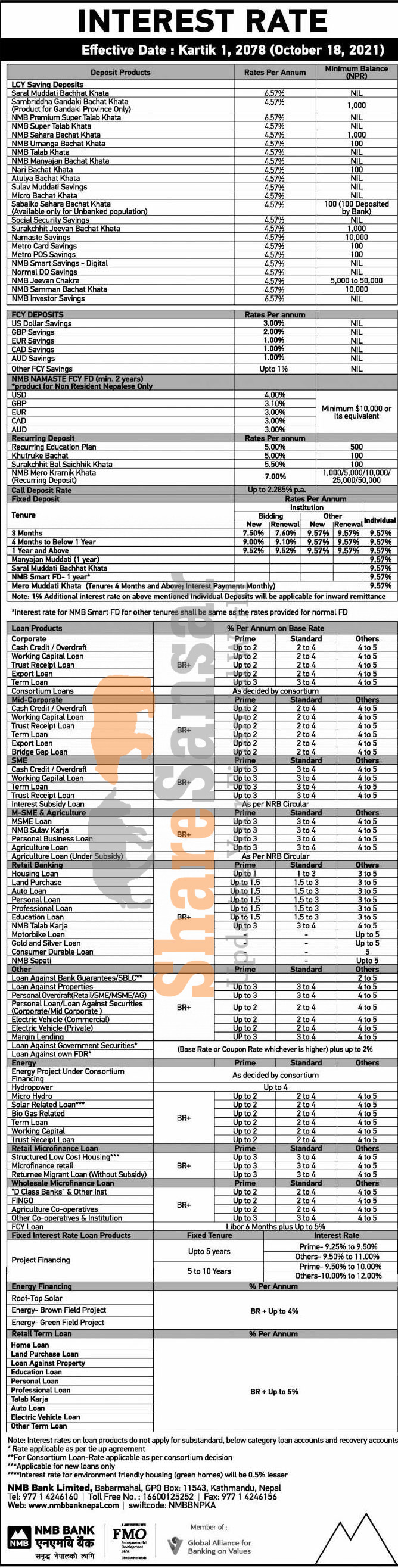 NMB Bank Limited has published a notice regarding the new interest rate for deposit and loan products and it's effective from 1st Kartik, 2078.