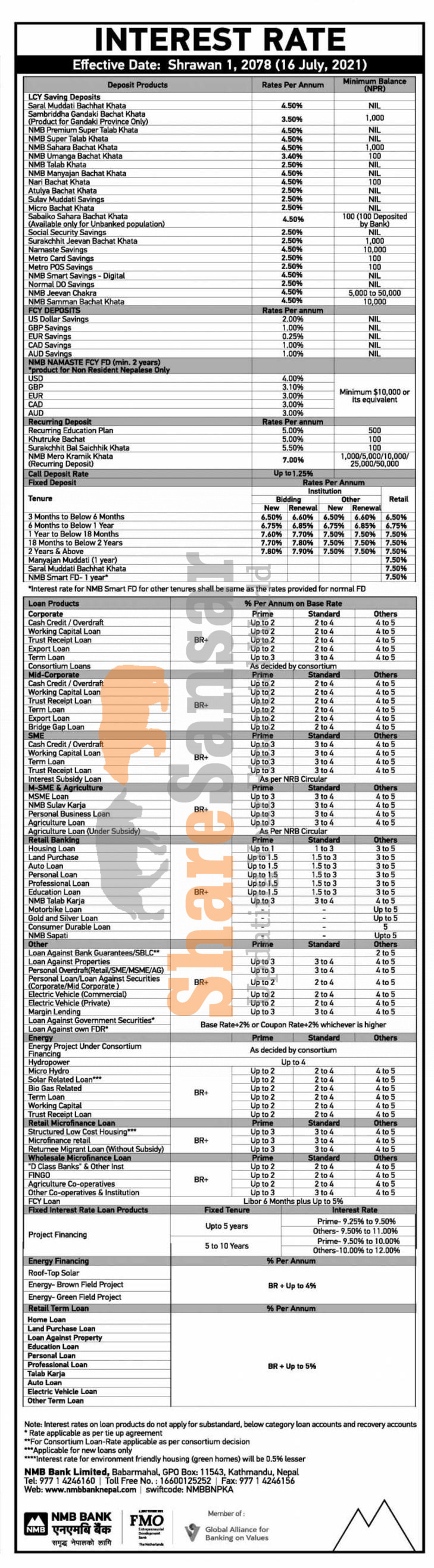 NMB Bank Limited has published a notice regarding the new interest rate for deposit and loan products and it's effective from 1st Shrawan, 2078.