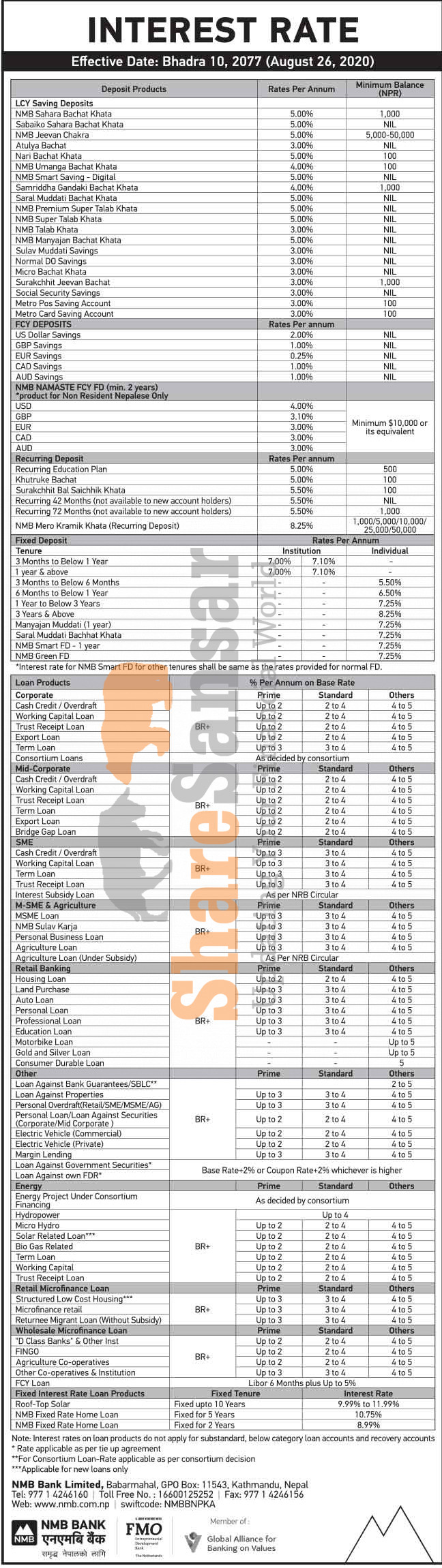 NMB Bank Limited has published a notice regarding the new interest rate for its deposit and loan products and its effective from 10th Bhadra, 2077.