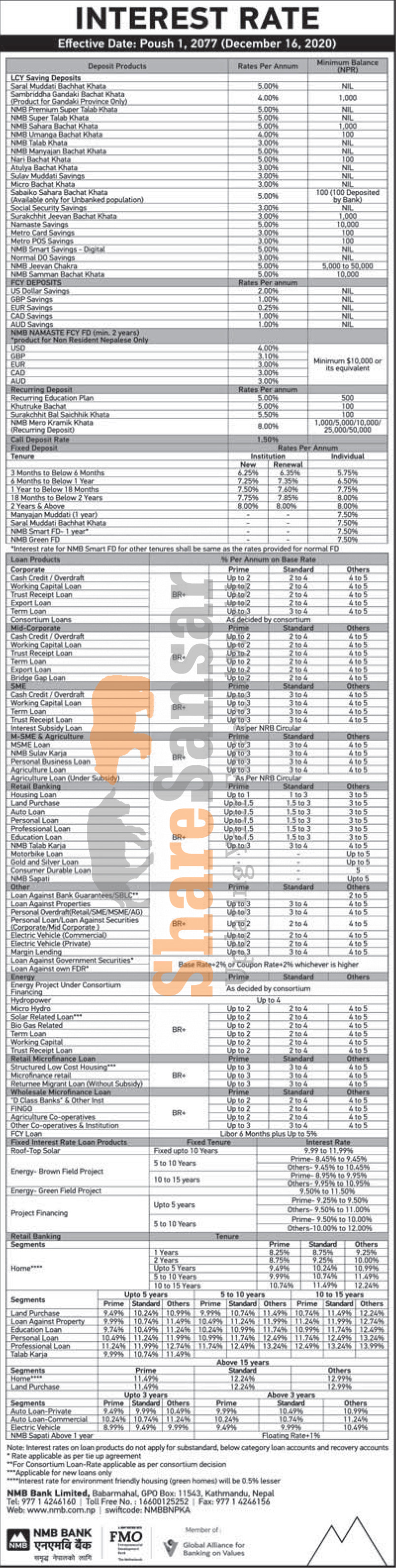 NMB Bank Limited has published a notice regarding the new interest rate for its deposit and loan products and it's effective from 1st Poush, 2077.