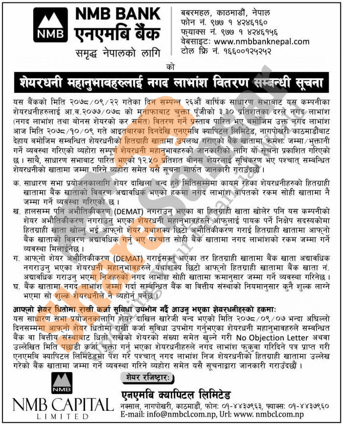 NMB Bank Limited is distributing 3.30% cash dividend directly to bank accounts of its shareholders from 9th Magh (today) and has urged to dematerialize their shares.