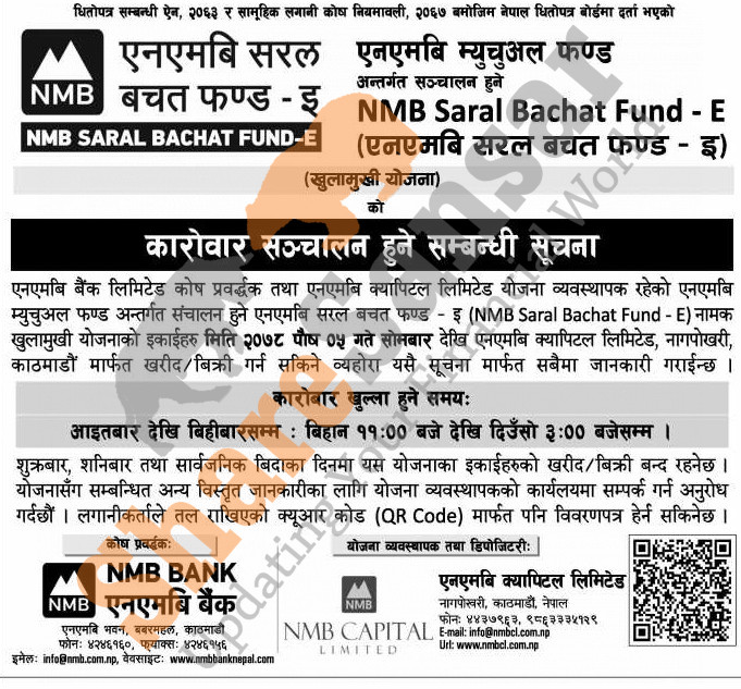 NMB Capital Limited has published a notice regarding the beginning of trading of its open-ended mutual fund "NMB Saral Bachat Fund - E" from 5th Poush, 2078 (today).