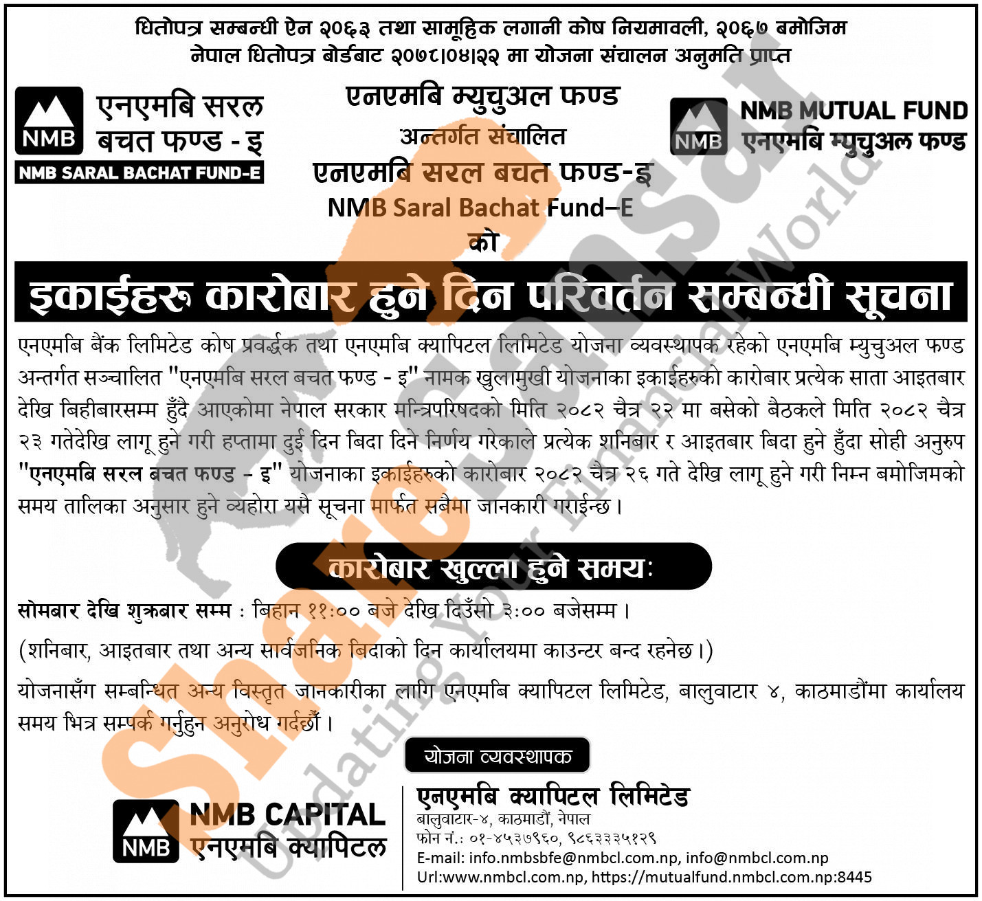 NMB Capital Limited has published a notice regarding the change in trading day of its open-ended mutual fund "NMB Saral Bachat Fund - E" and it's effective from today (26th Chaitra, 2082).