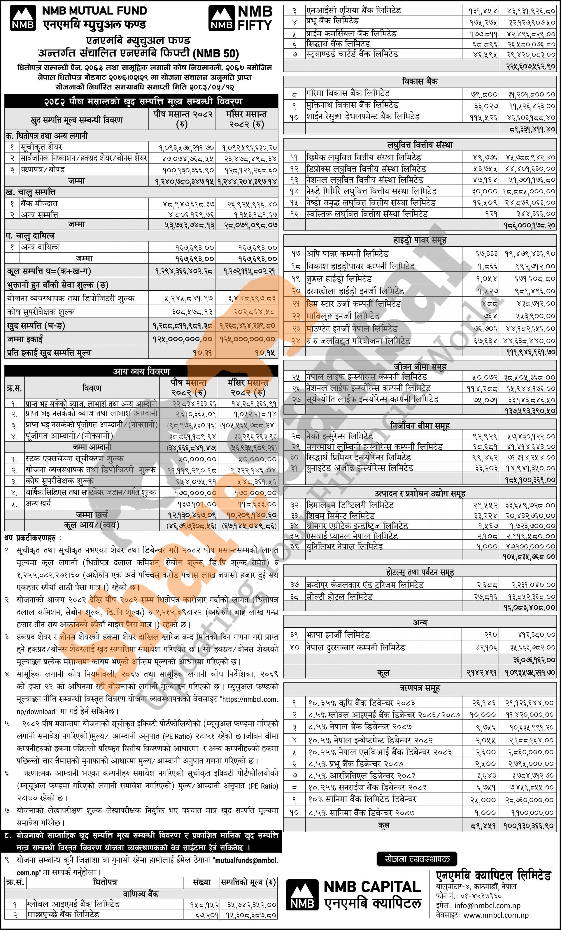 NMB Capital Limited has published "NMB 50" Net Assets Value (NAV) till Poush, 2082.