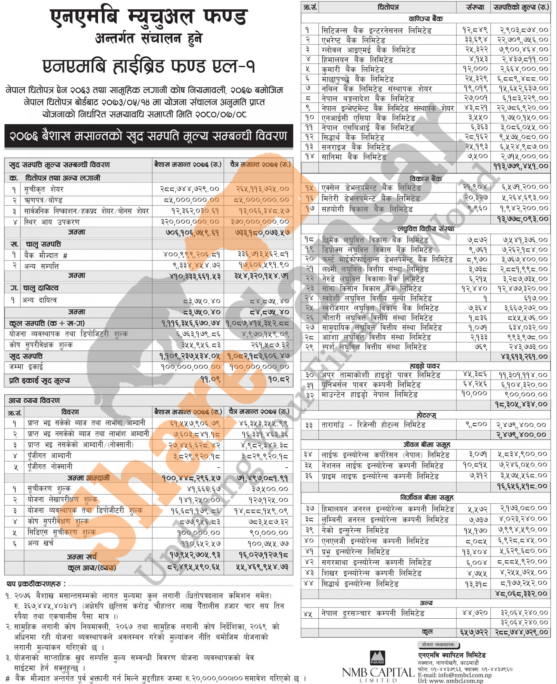 NMB Capital Limited has published (NMB Hybrid Fund L-1) Net Assets Value (NAV) till Baishakh, 2076.