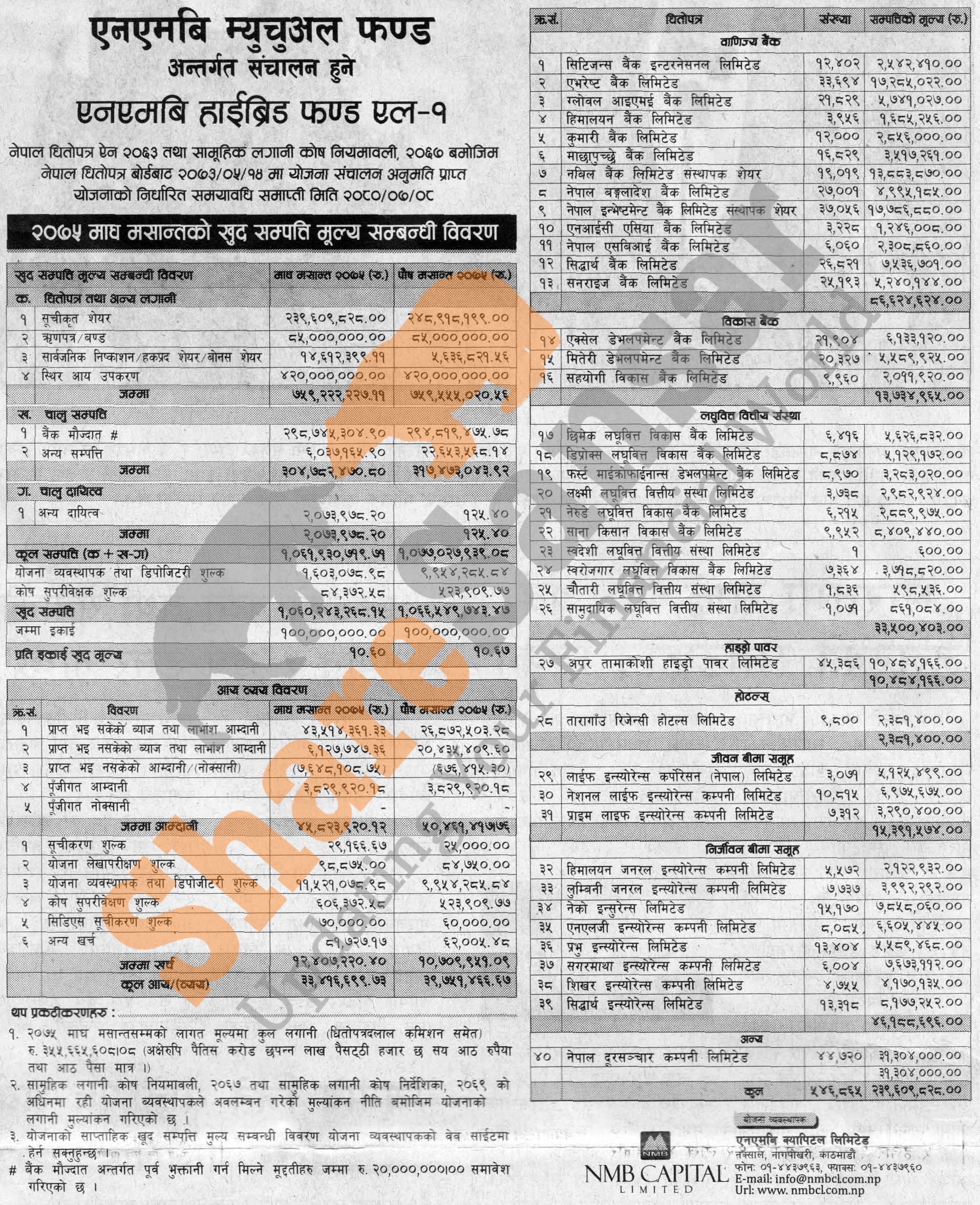 NMB Capital Limited has published (NMB Hybrid Fund L-1) Net Assets Value (NAV) till Magh, 2075.