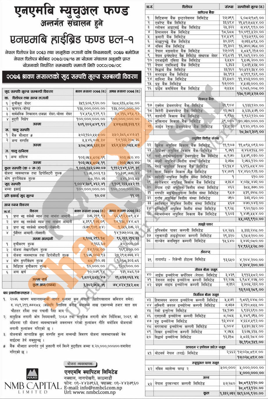 NMB Capital Limited has published (NMB Hybrid Fund L-1) Net Assets Value (NAV) till Shrawan, 2076.