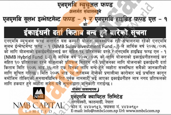 NMB Capital Limited has published “NMB Sulav Investment Fund – 1 and NMB Hybrid Fund L-1” book closure date for its cash dividend purpose on 26th Bhadra, 2076.