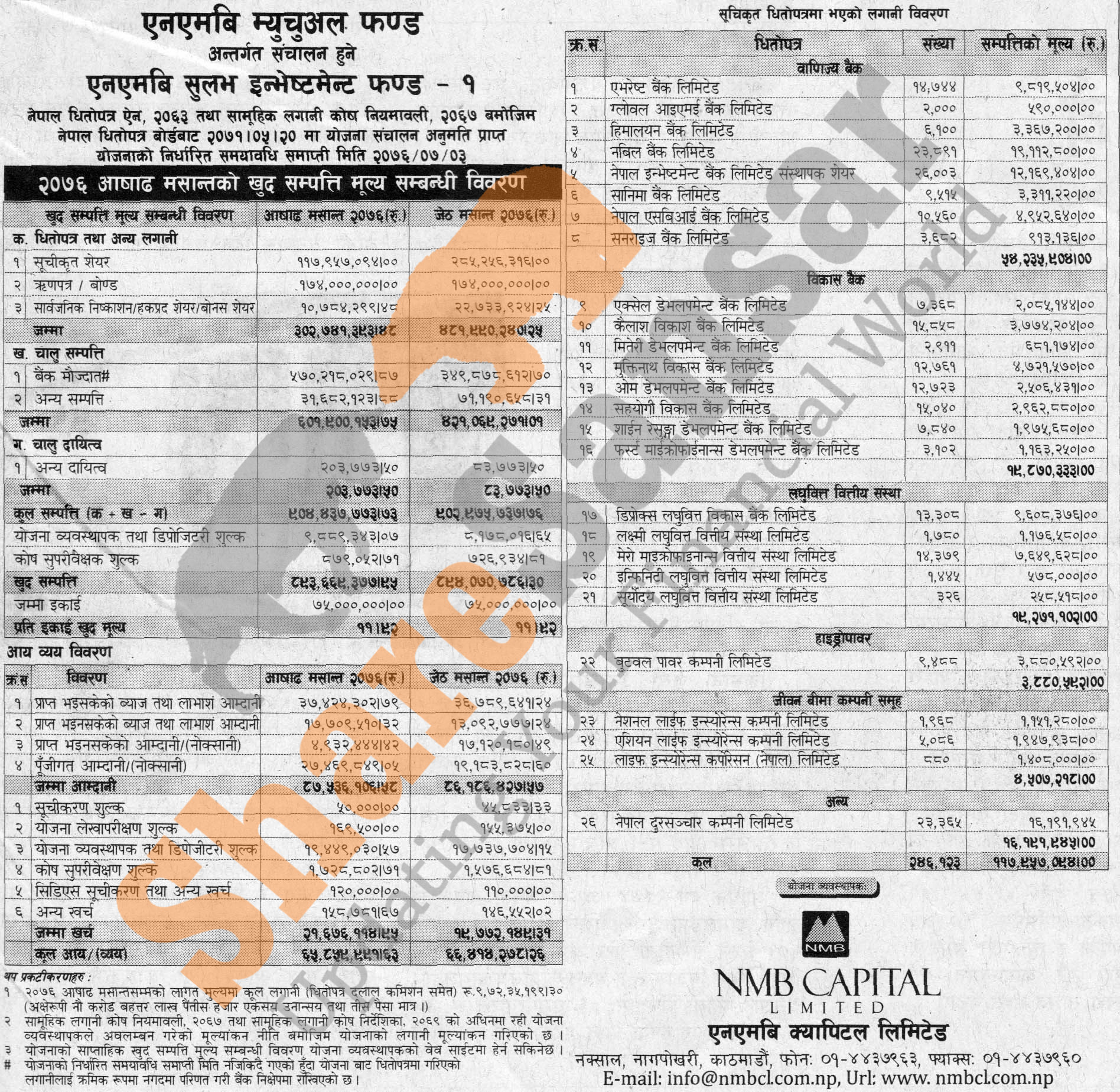 NMB Capital Limited has published (NMB Sulav Investment Fund-1) Net Assets Value (NAV) till Ashad, 2076.