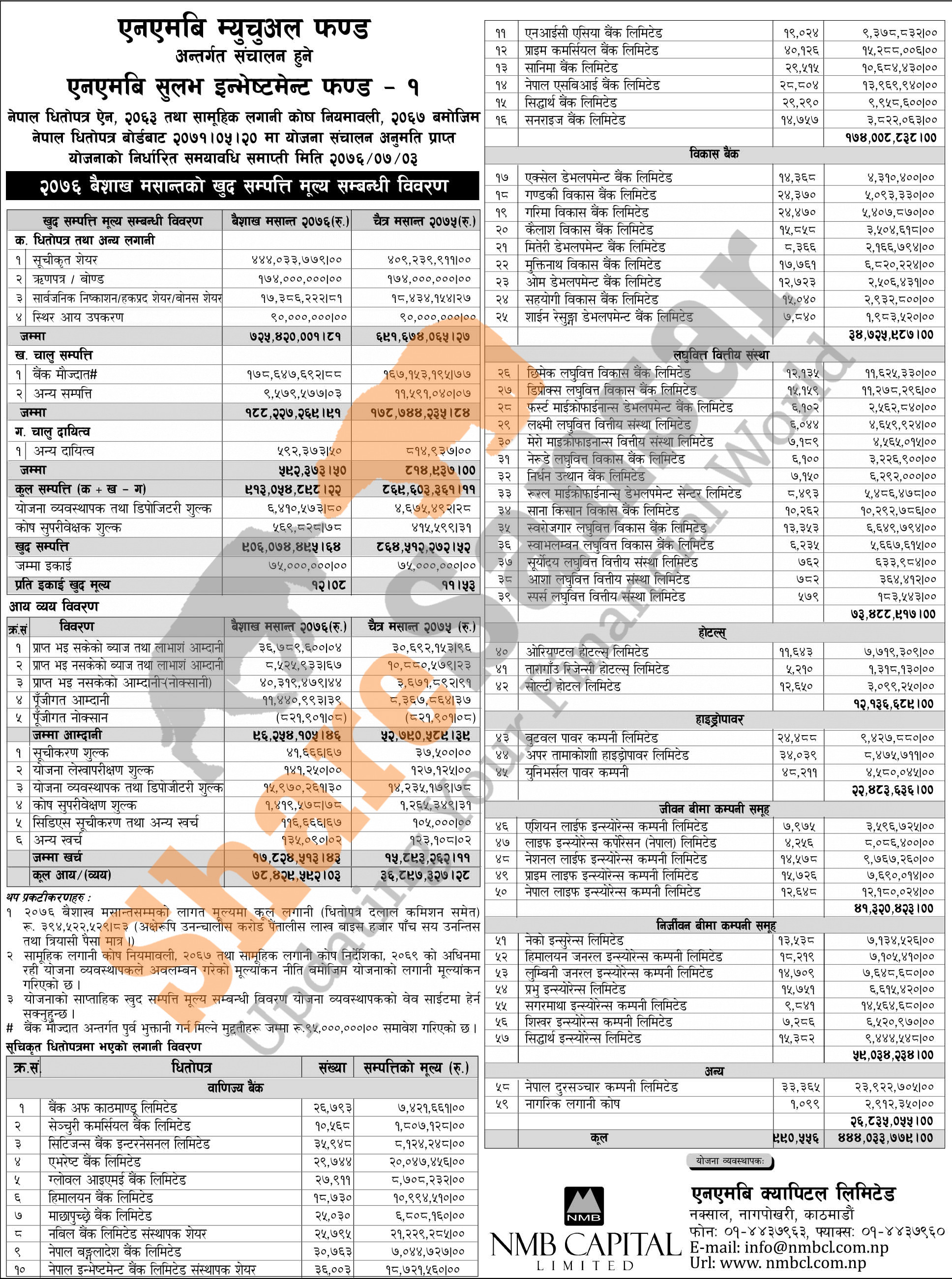 NMB Capital Limited has published (NMB Sulav Investment Fund-1) Net Assets Value (NAV) till Baishakh, 2076.