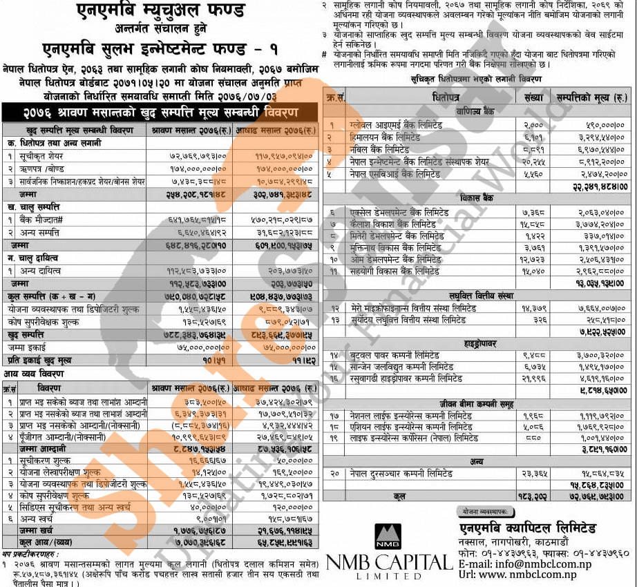 NMB Capital Limited has published (NMB Sulav Investment Fund-1) Net Assets Value (NAV) till Shrawan, 2076.
