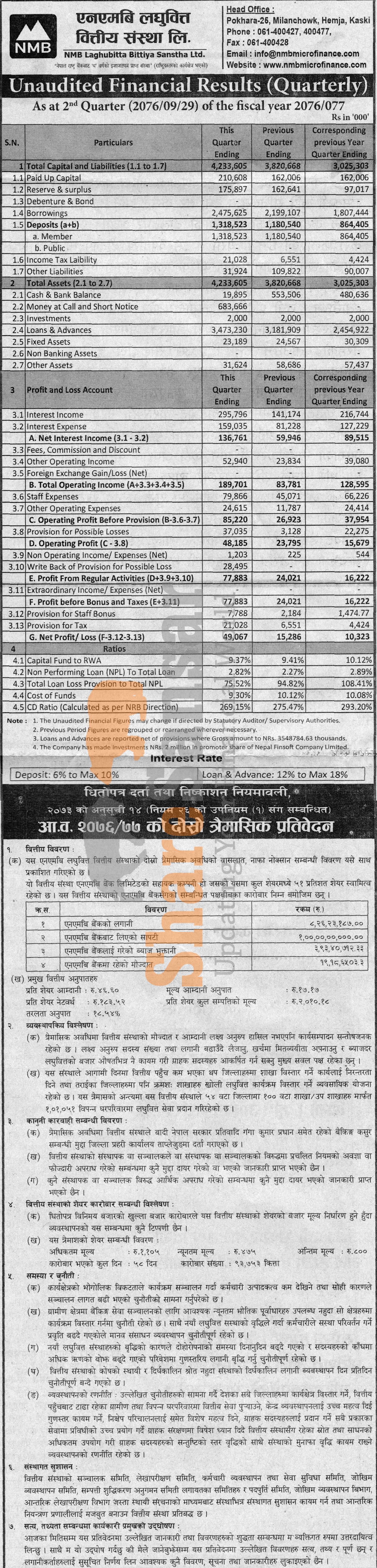 NMB Laghubitta Bittiya Sanstha Limited has posted a net profit of Rs 49.06 million and published its 2nd quarter company analysis of the fiscal year 2076/77.