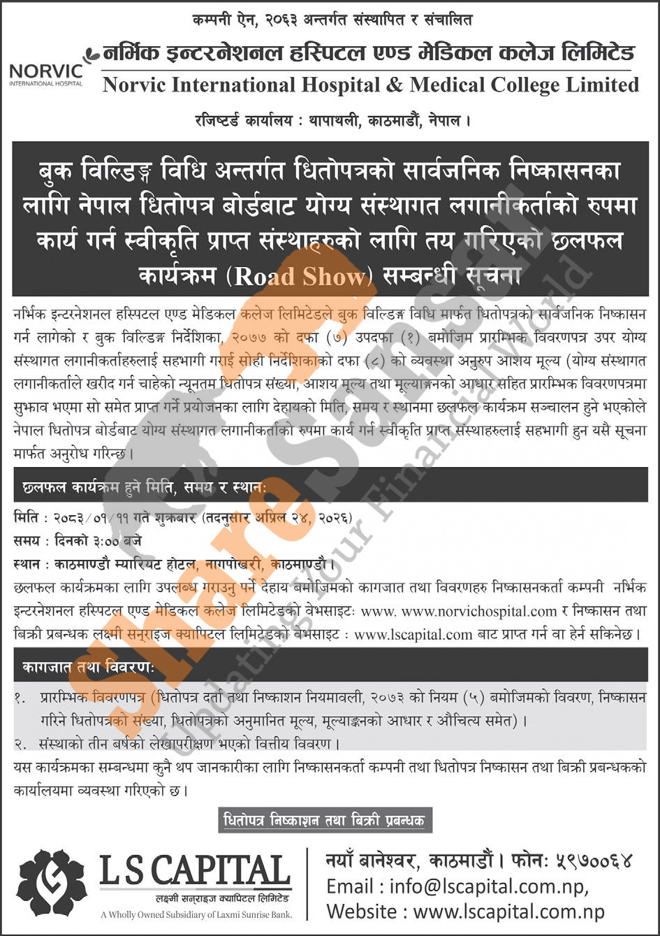 Norvic International Hospital and Medical College Limited has published a notice to the qualified institutional investors regarding Road Show (discussion program) for the issuance of IPO under book building method on 11th Baisakh, 2083.