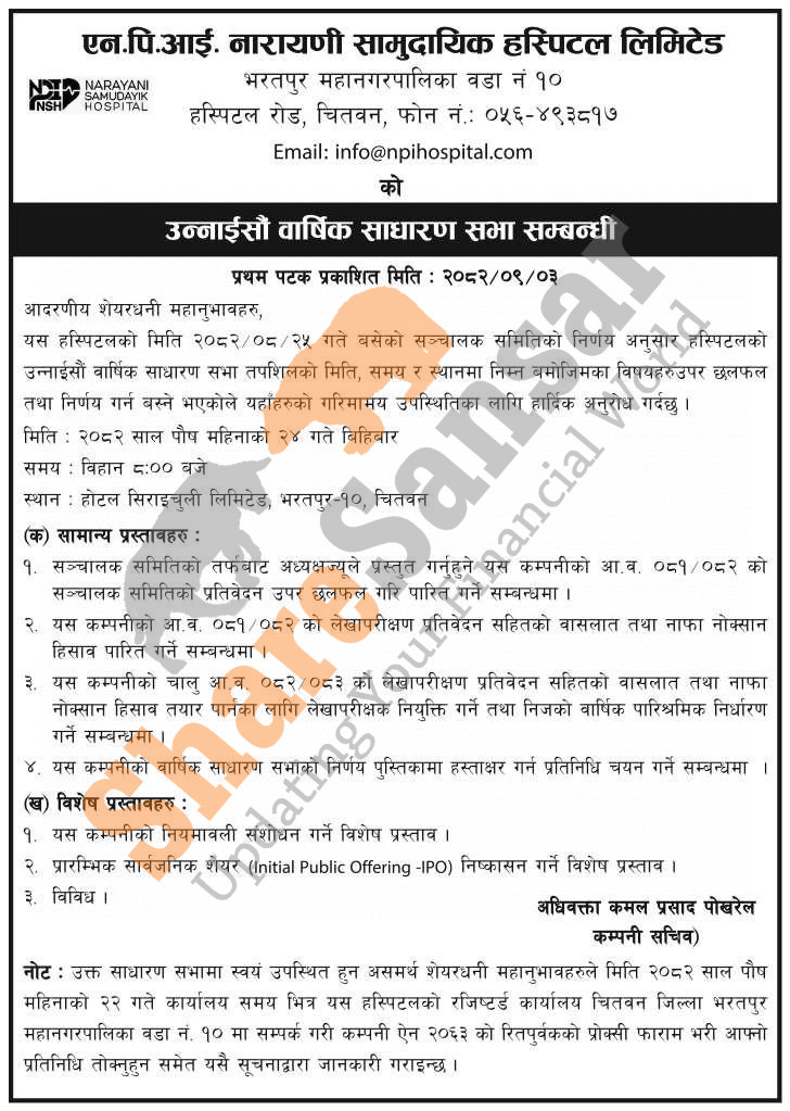 N.P.I. Narayani Samudayik Hospital Limited has announced its 19th AGM going to be held on 24th Poush, 2082.
