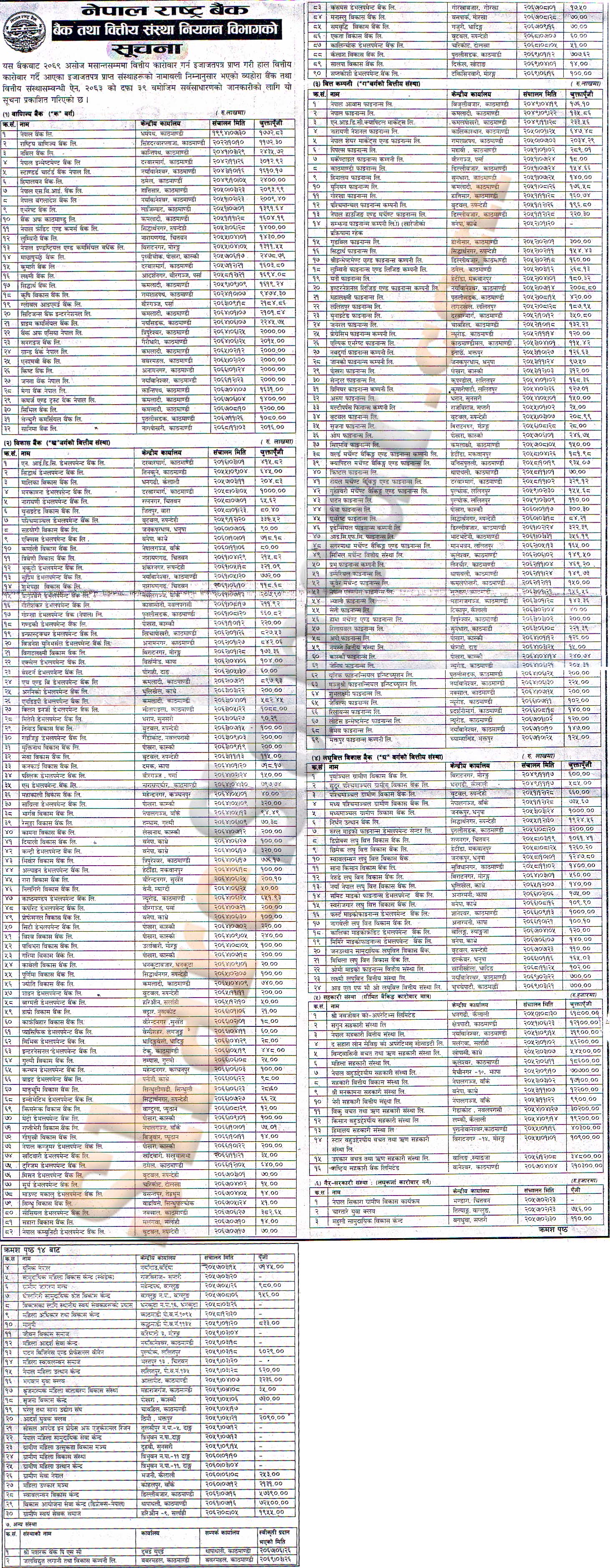NRB has published a list of Banks and Financial Institutions with their corresponding paid up capital as of Asoj end, 2069.