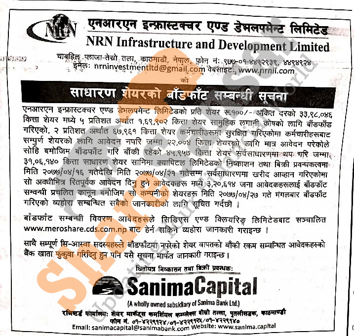 NRN Infrastructure and Development Limited has allotted its 33,98,046 units IPO shares to the general public, employees, and mutual fund on 27th Shrawan, 2077.