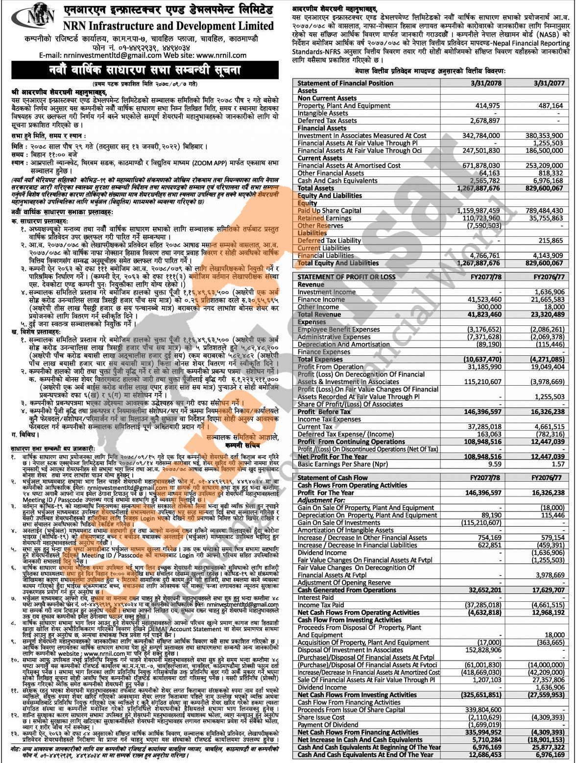 NRN Infrastructure and Development Limited has announced its 9th AGM going to be held on 29th Poush, 2078 and has published audited financial highlights of FY 2077/78.