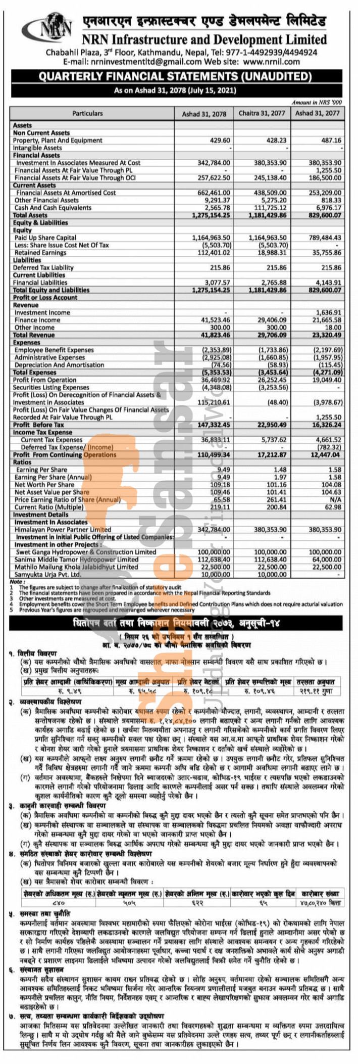 NRN Infrastructure and Development Limited has posted a net profit of Rs 110.49 million and published its 4th quarter company analysis of the fiscal year 2077/78.