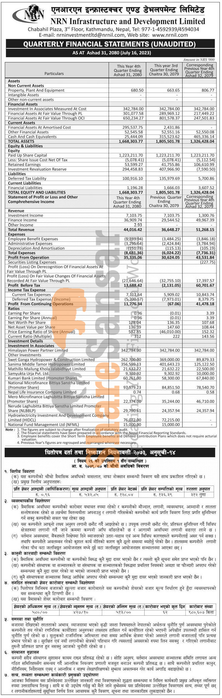 NRN Infrastructure and Development Limited has posted a net profit of Rs 11.77 million and published its 4th quarter company analysis of the fiscal year 2079/80.