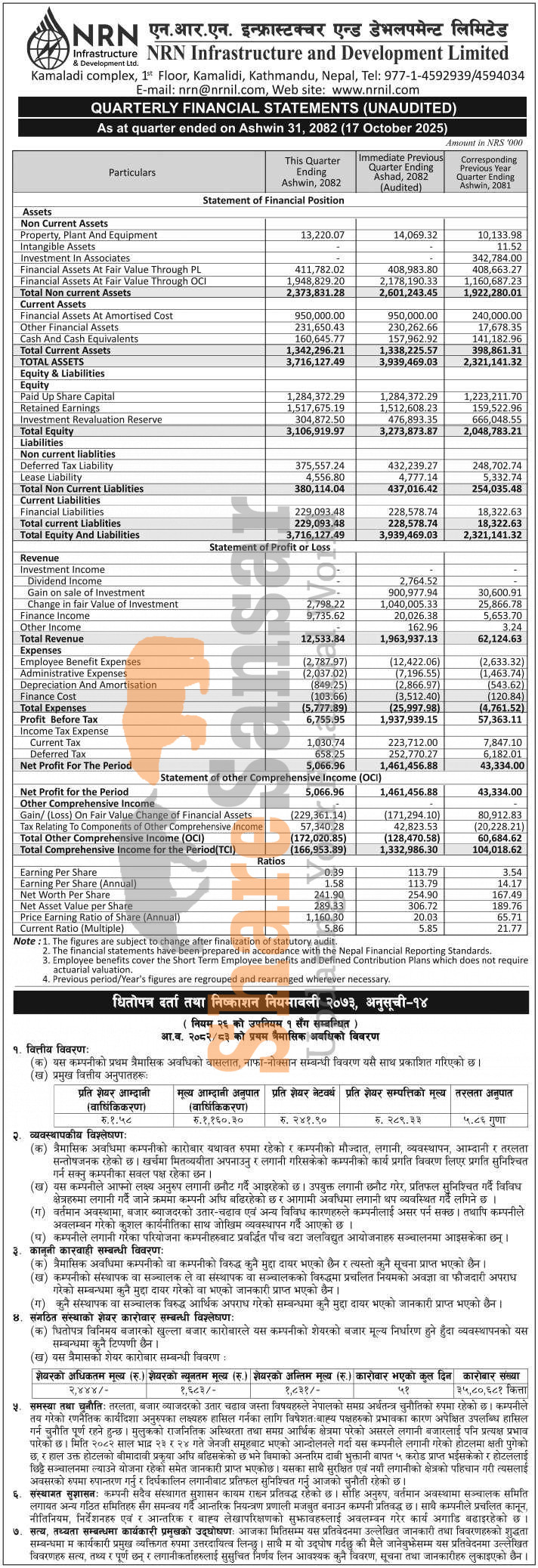 NRN Infrastructure and Development Limited has posted a net profit of Rs 5.06 million and published its 1st quarter company analysis of the fiscal year 2082/83.