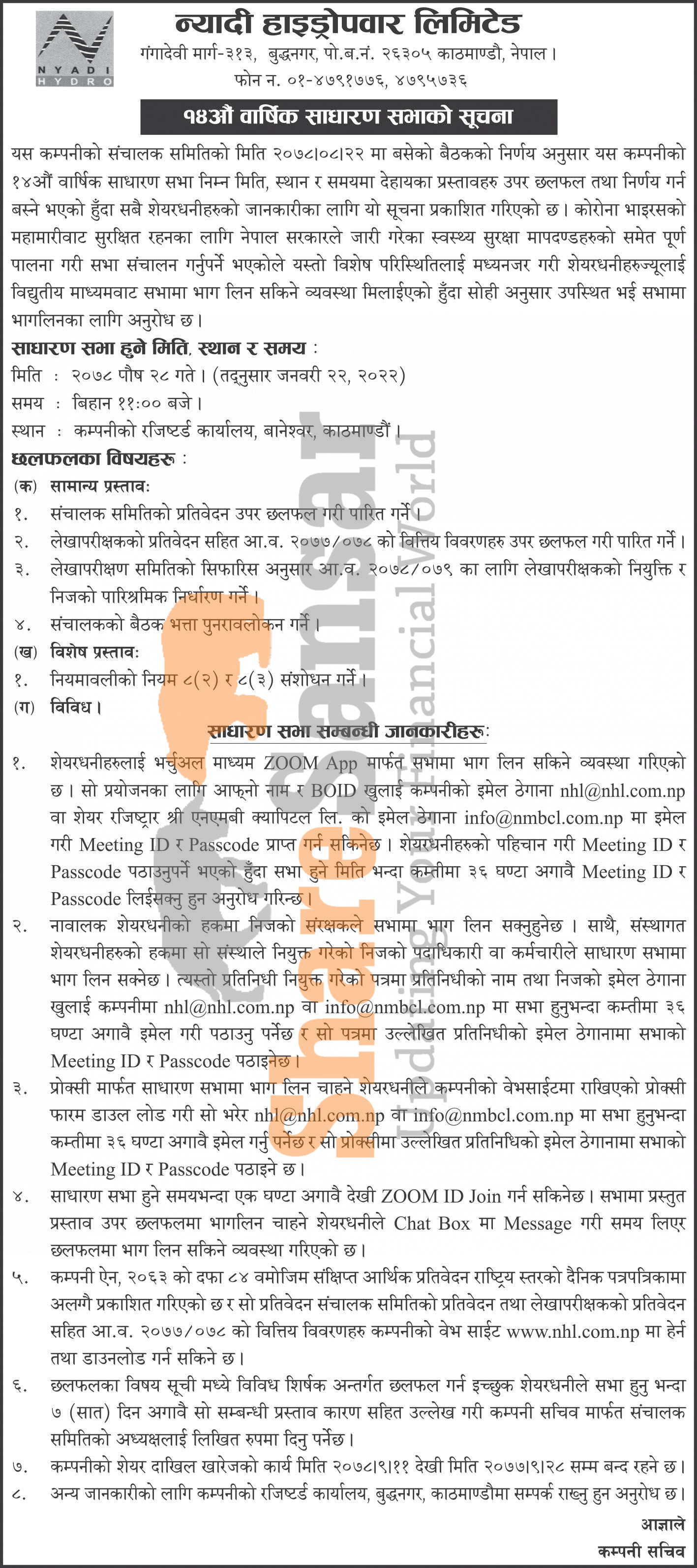 Nyadi Hydropower Company Limited has announced its 14th AGM going to be held on 28th Poush, 2078.