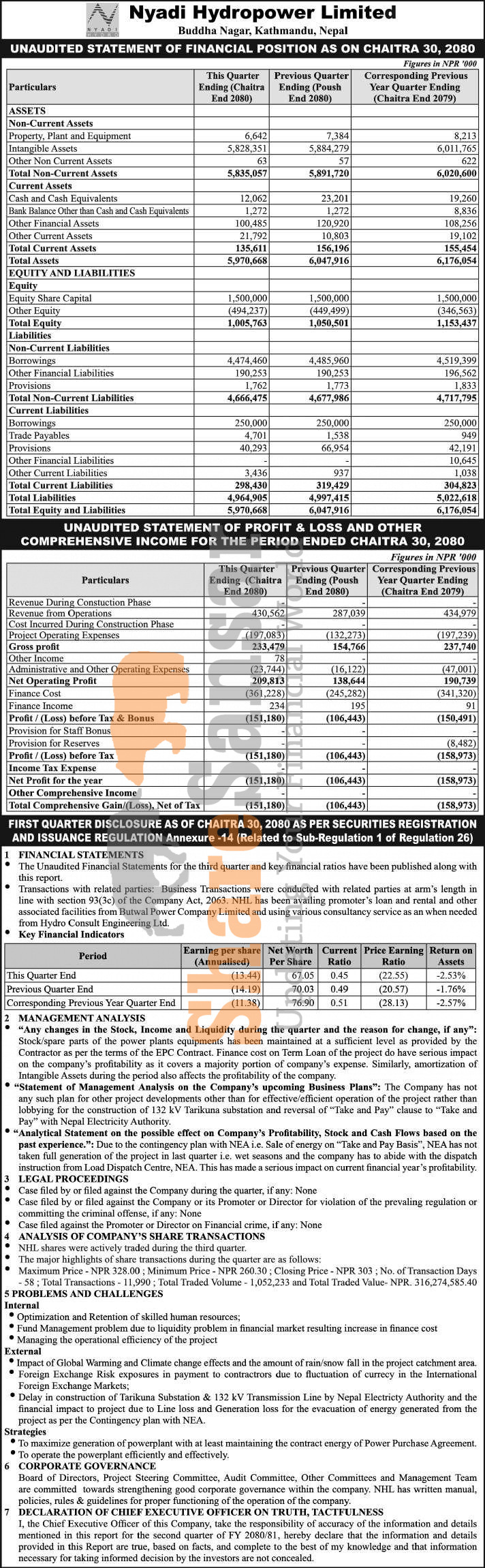 Nyadi Hydropower Limited has posted a net loss of Rs 151.18 million and published its 3rd quarter company analysis of the fiscal year 2080/81.