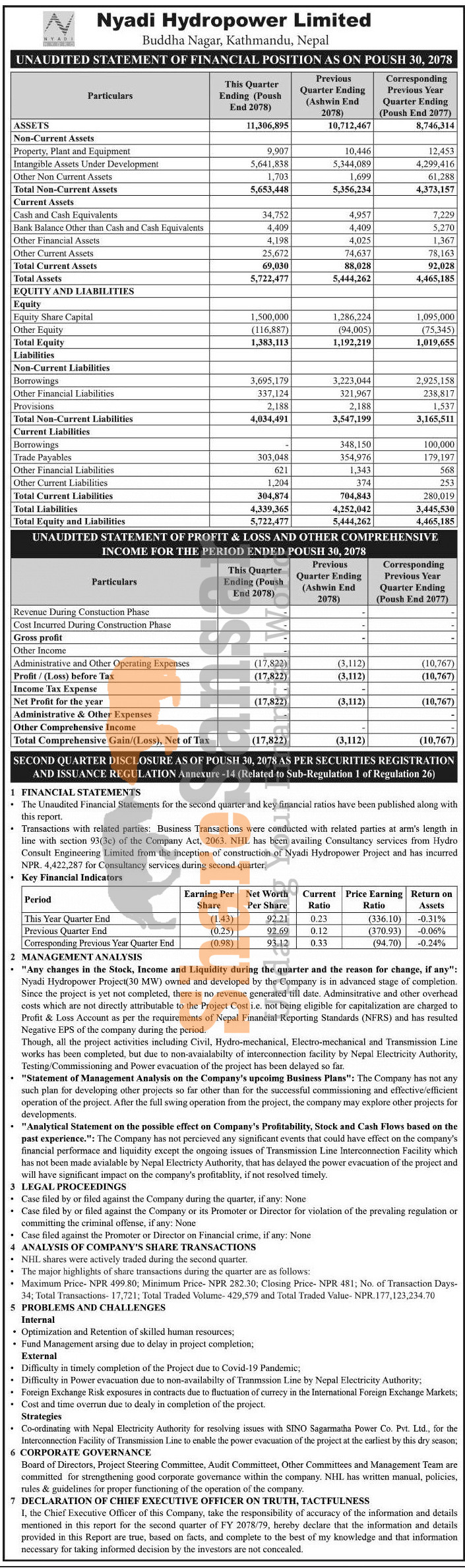 Nyadi Hydropower Limited has posted a net loss of Rs 17.82 million and published its 2nd quarter company analysis of the fiscal year 2078/79.