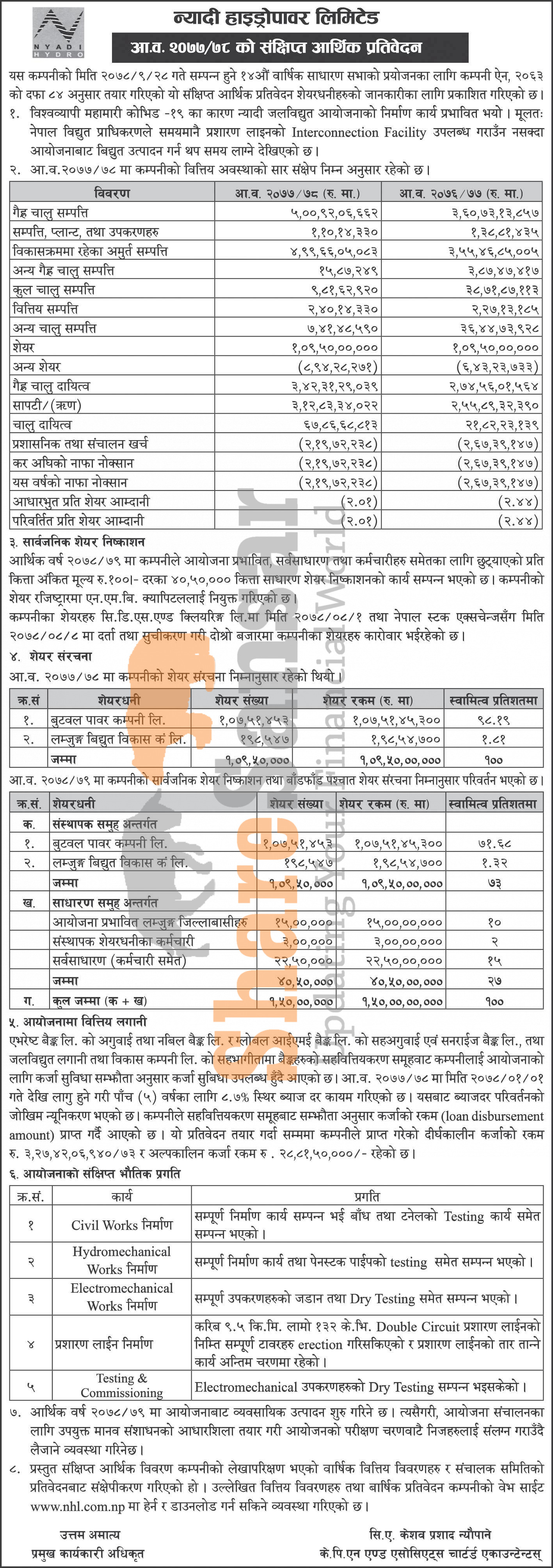 Nyadi Hydropower Limited has published its annual financial statement of the fiscal year 2077/78.